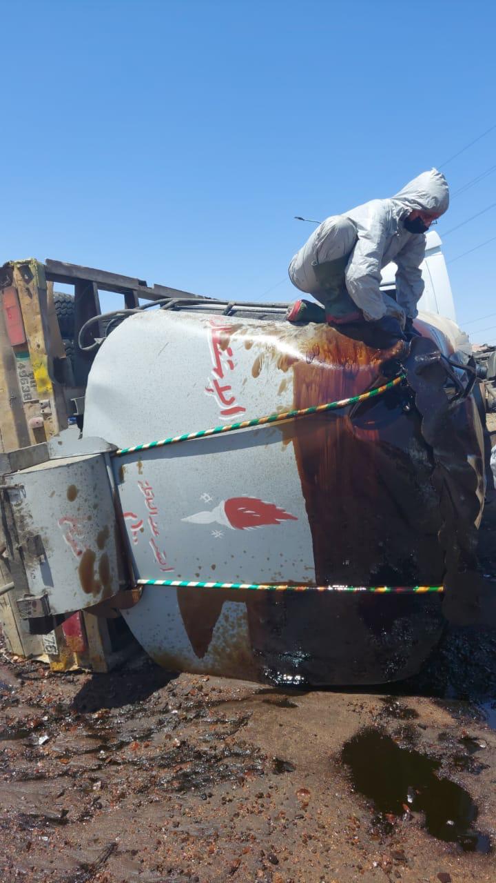 حيث عملت فرق الانقاذ على معالجة التسرب تحت ظروف جوية صعبة ودرجات حرارة مرتفعة وتمكنوا من إيقاف التسرب بكل حرفية وحالوا بذلك دون وقوع اية اصابات او اشتعال تلك المواد البترولية.