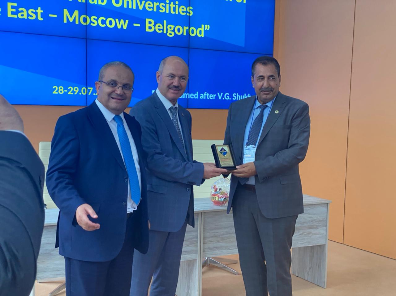 كما سلّم كل من عبيدات والمراشدة درع الجامعة لكل من راعية المؤتمر معالي الدكتورة نائبة وزير التعليم العالي والبحث العلمي في جمهورية روسيا الإتحادية والدكتور رئيس جامعة بلجورود التقنية المستضيفة للمؤتمر؛ كما تم توقيع عدد من الإتفاقيات بين جامعة جدارا والجامعات الروسية المشاركة بالملتقى.