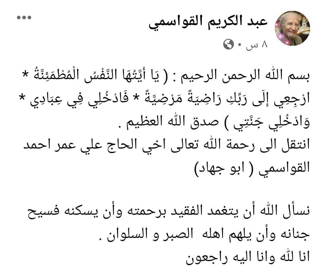 الحاج علي القواسمي ابو جهاد في ذمة الله "شقيق الفنان عبدالكريم القواسمي"