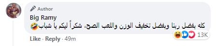 وتفاعل ممدوح السبيعى، الشهير بيج رامى بطل كمال الأجسام، بتوجيه الشكر لكل من وجه له رسالة دعم مع الرد على تساؤلات الجمهور في التعليقات قائلا: "كله بفضل ربنا وبفضل تخفيف الوزن واللعب الصح، شكراً ليكم يا شباب".