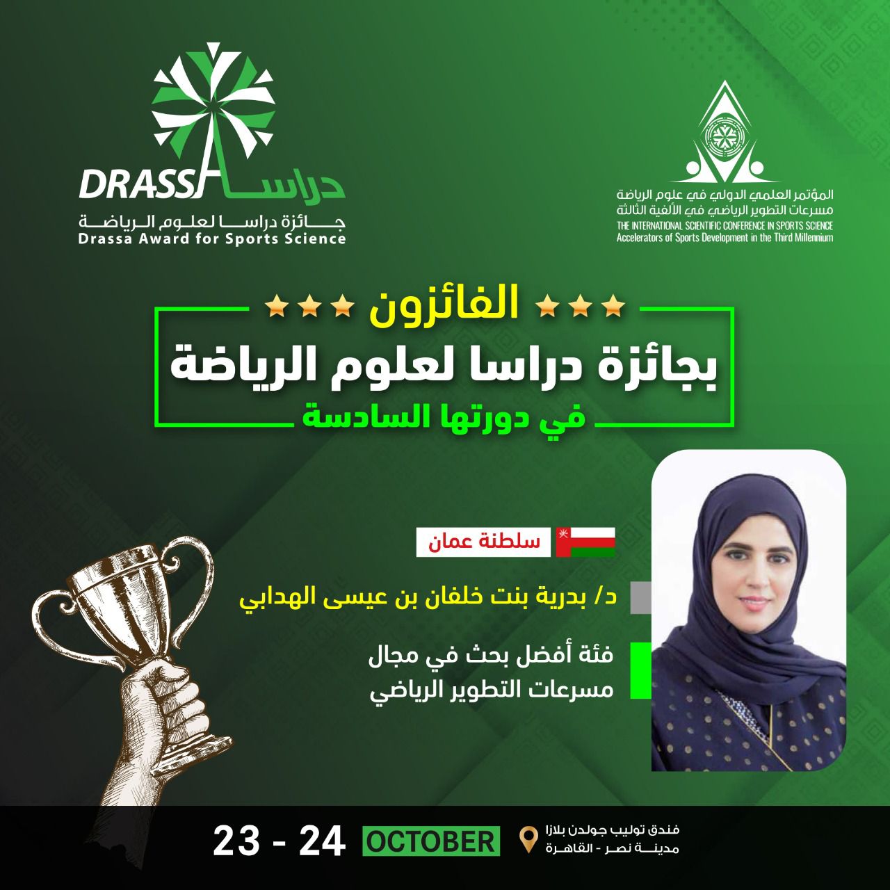 فازت بها الدكتورة بدرية الهدابية من سلطنة عمان وذلك عن بحث بعنوان “ تصنيف مستوي السلوك الخامل والنشاط البدني باستخدام حدود القطع لجهاز التسارع الحركي لدي الاطفال من 9-11 سنه "