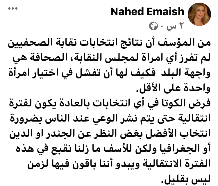 من المؤسف أن نتائج انتخابات نقابة الصحفيين لم تفرز أي امراة لمجلس النقابة، الصحافة هي واجهة البلد فكيف لها أن تفشل في اختيار امرأة واحدة على الأقل.