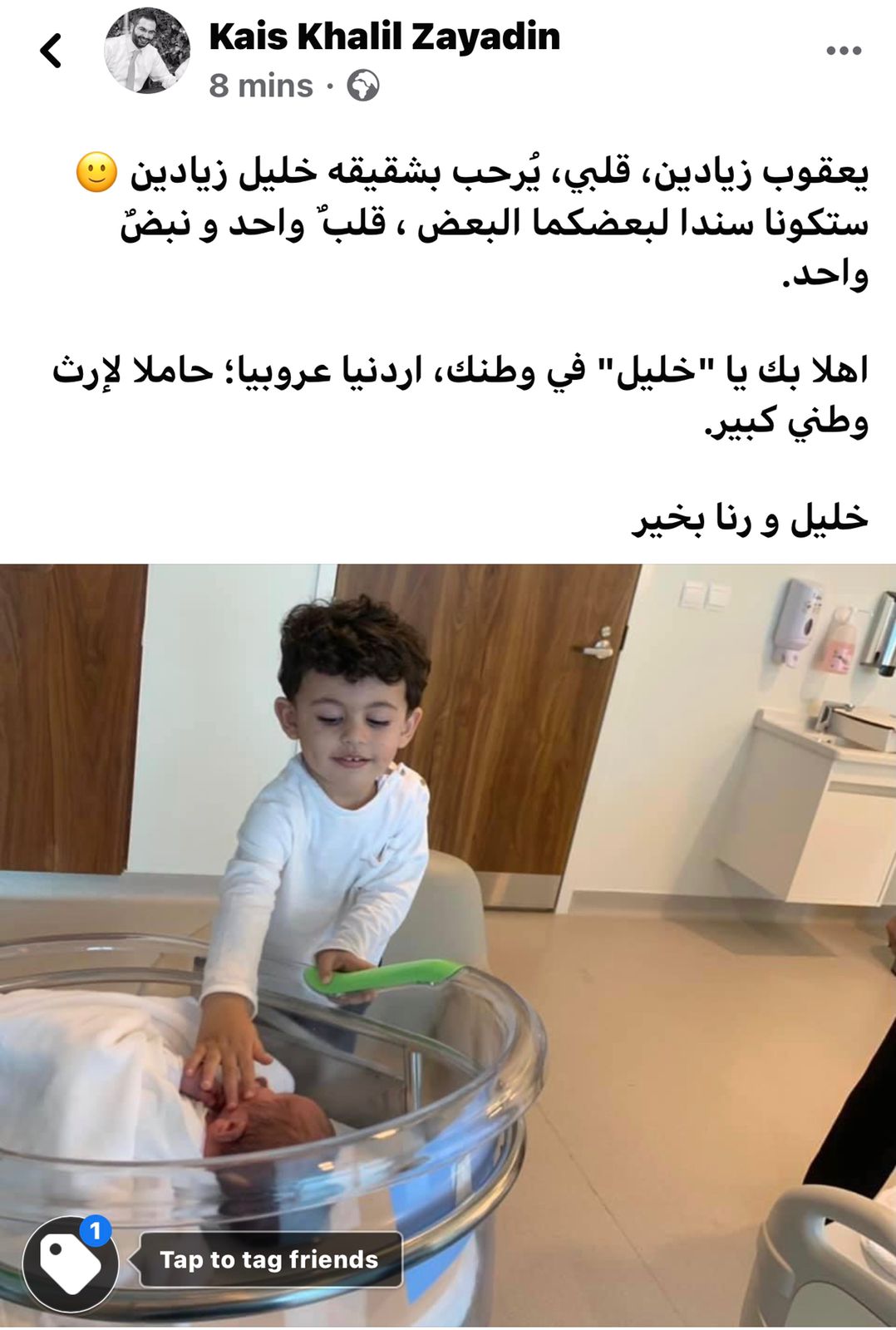 رزق النائب السابق قيس زيادين وزوجته رنا العلم بمولودهم الثاني واختارا له من الأسماء اسم خليل .
