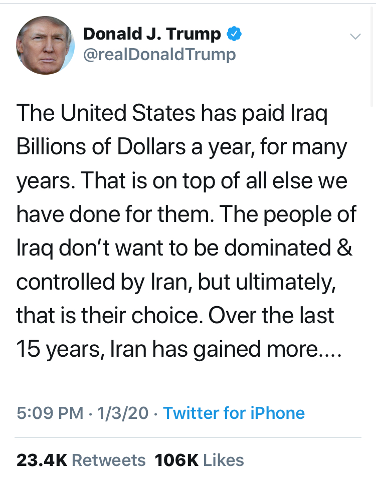 ترمب :- امريكا دفعت مليارات الدولارات للعراق