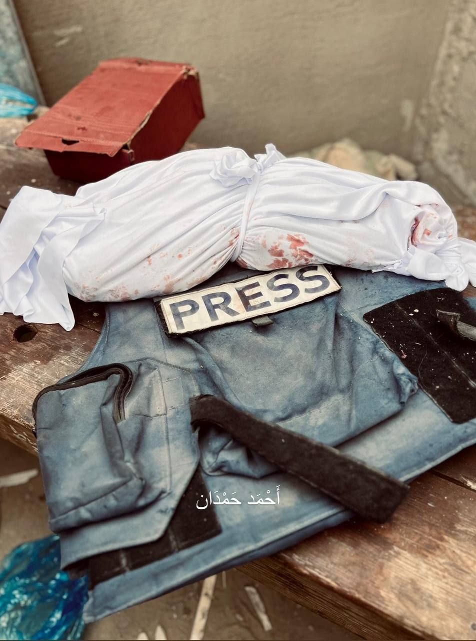 ما تبقى من جسد الشهيد الصحفي حسن حمد الذي ارتقى بقصف مدفعي على مخيم جباليا فجر اليوم