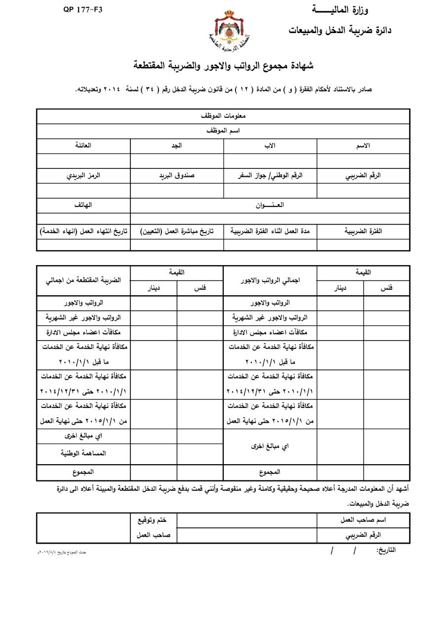 الضريبة: تدعو المدراء الماليين للالتزام بنموذج شهادة الرواتب والاجور والضريبة المقتطعة