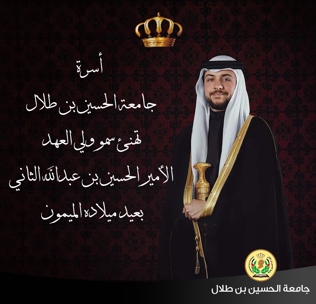 رئيس جامعة البلقاء التطبيقية وأسرة الجامعة يهنئون صاحب السمو الملكي الأمير الحسين بن عبدالله الثاني ولي العهد الأمين بعيد ميلاده الميمون*