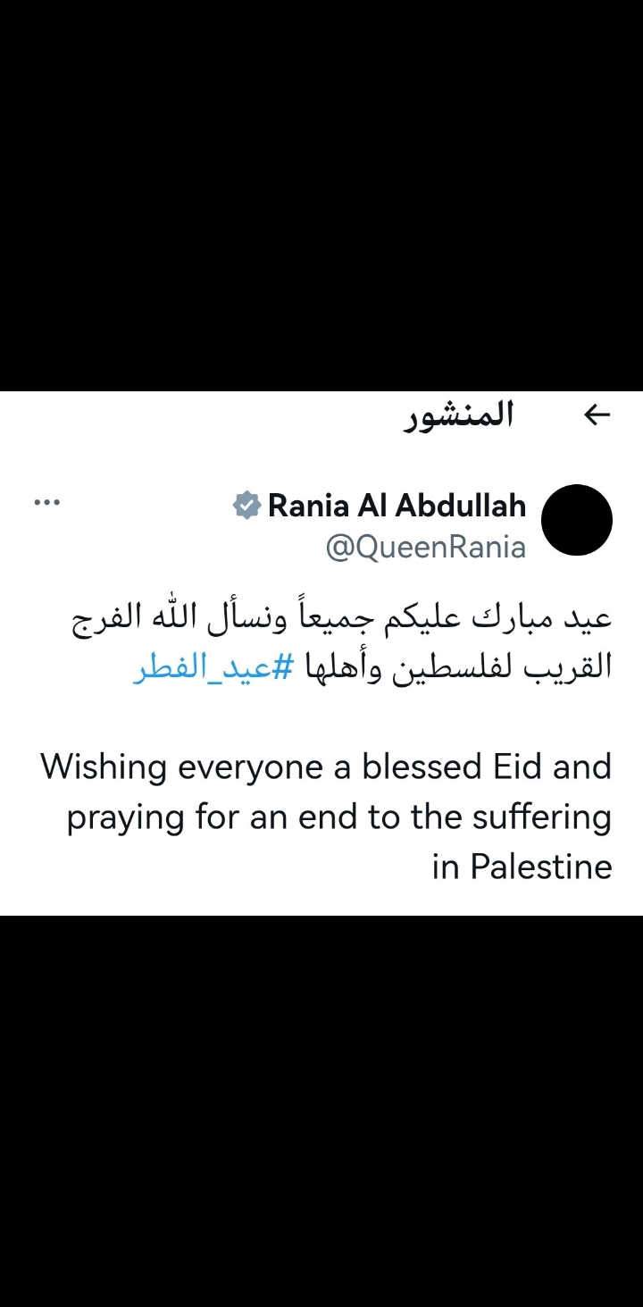 الملكة: عيد مبارك عليكم جميعاً ونسأل الله الفرج القريب ل #فلسطين وأهلها