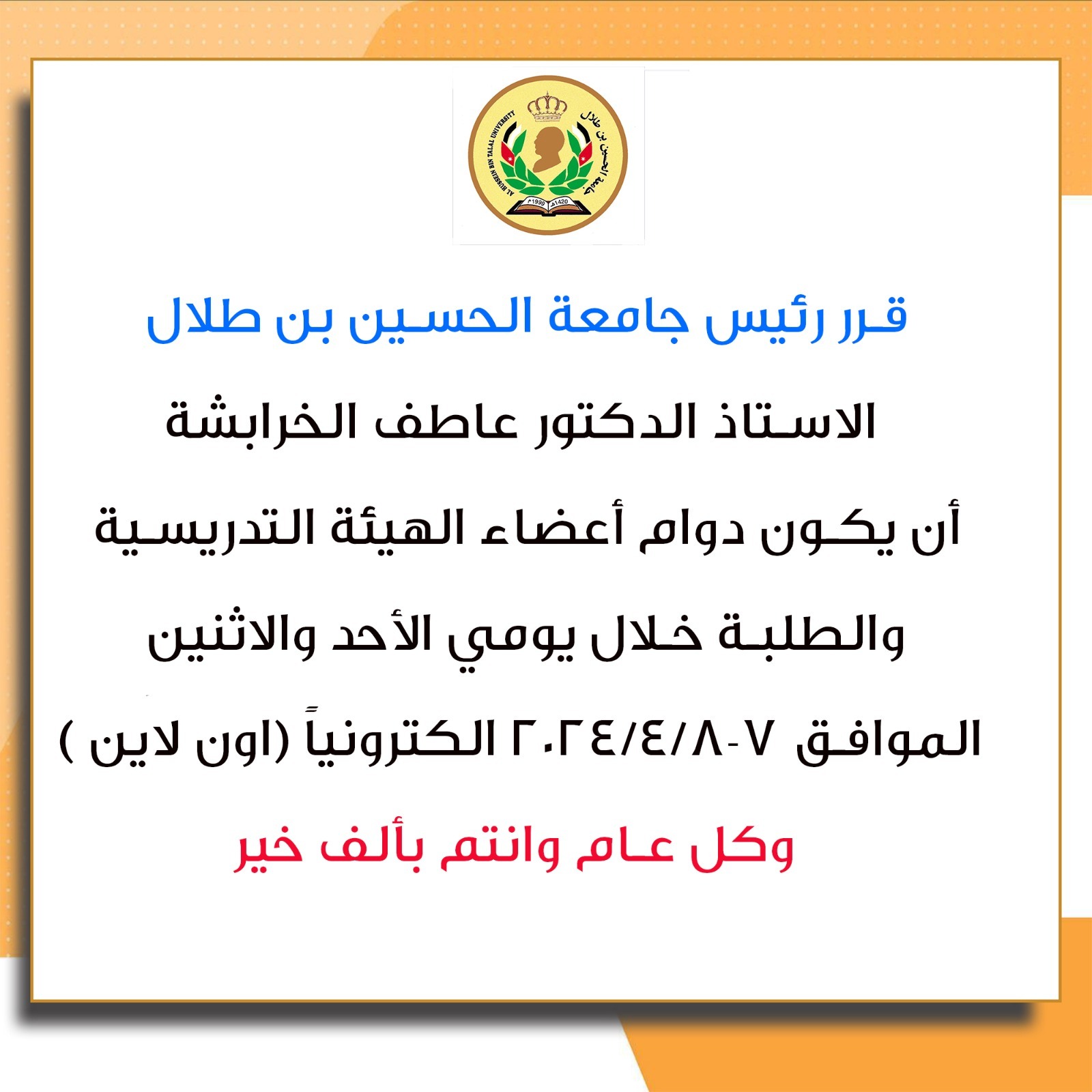 تحويل الدوام في جامعة الحسين بن طلال الأحد والاثنين إلى إلكتروني