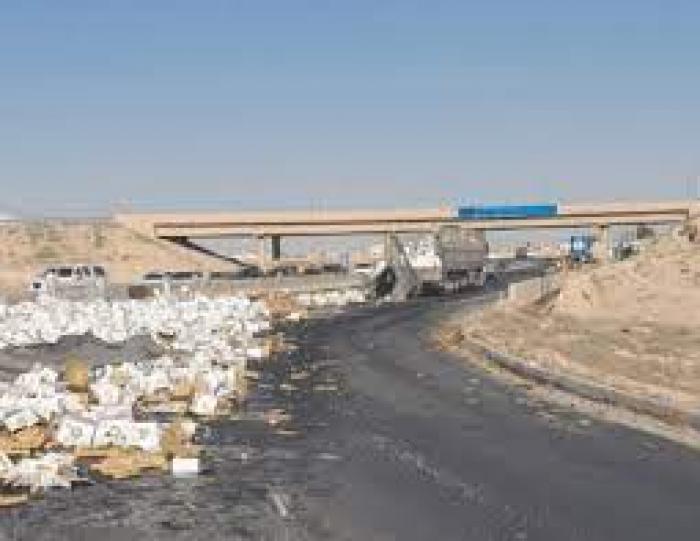 كاد أن يتسبب بكارثة .. سقوط حمولة احدى الشاحنات على طريق المفرق - الزرقاء