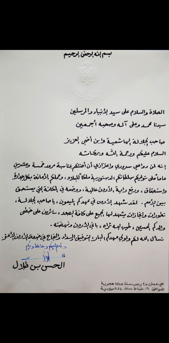 الحسن بن طلال يهنئ الملك بمناسبة مرور 25 عاما على تولي جلالته سلطاته الدستورية