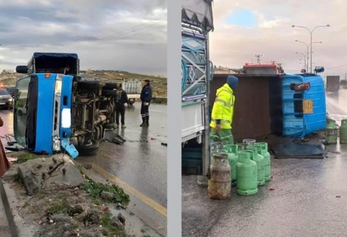 بالصور .. انقلاب مركبة شحن مُحملة بالغاز على شارع الحزام الدائري