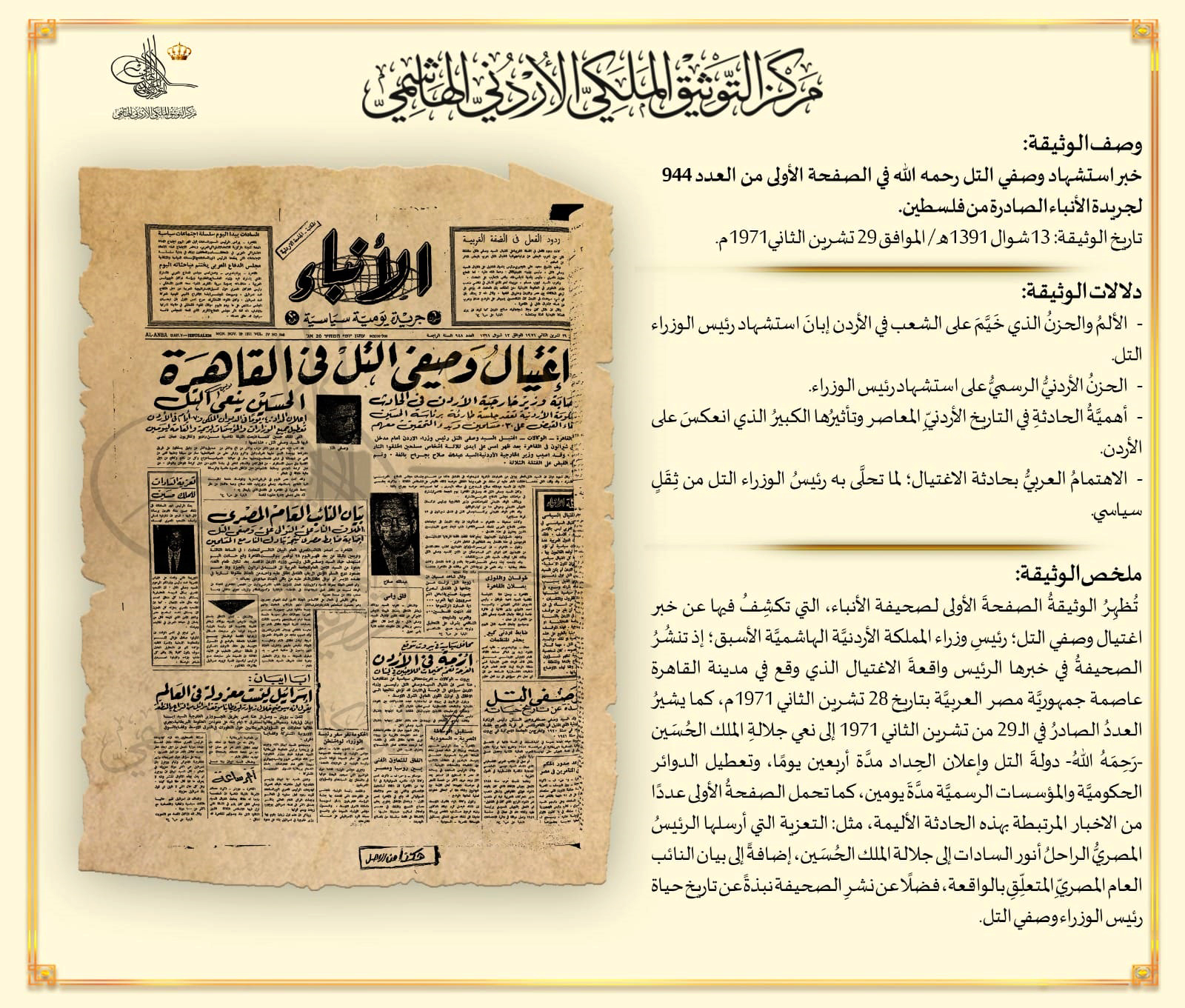 التوثيق الملكي يعرض وثيقة بذكرى اغتيال وصفي التل