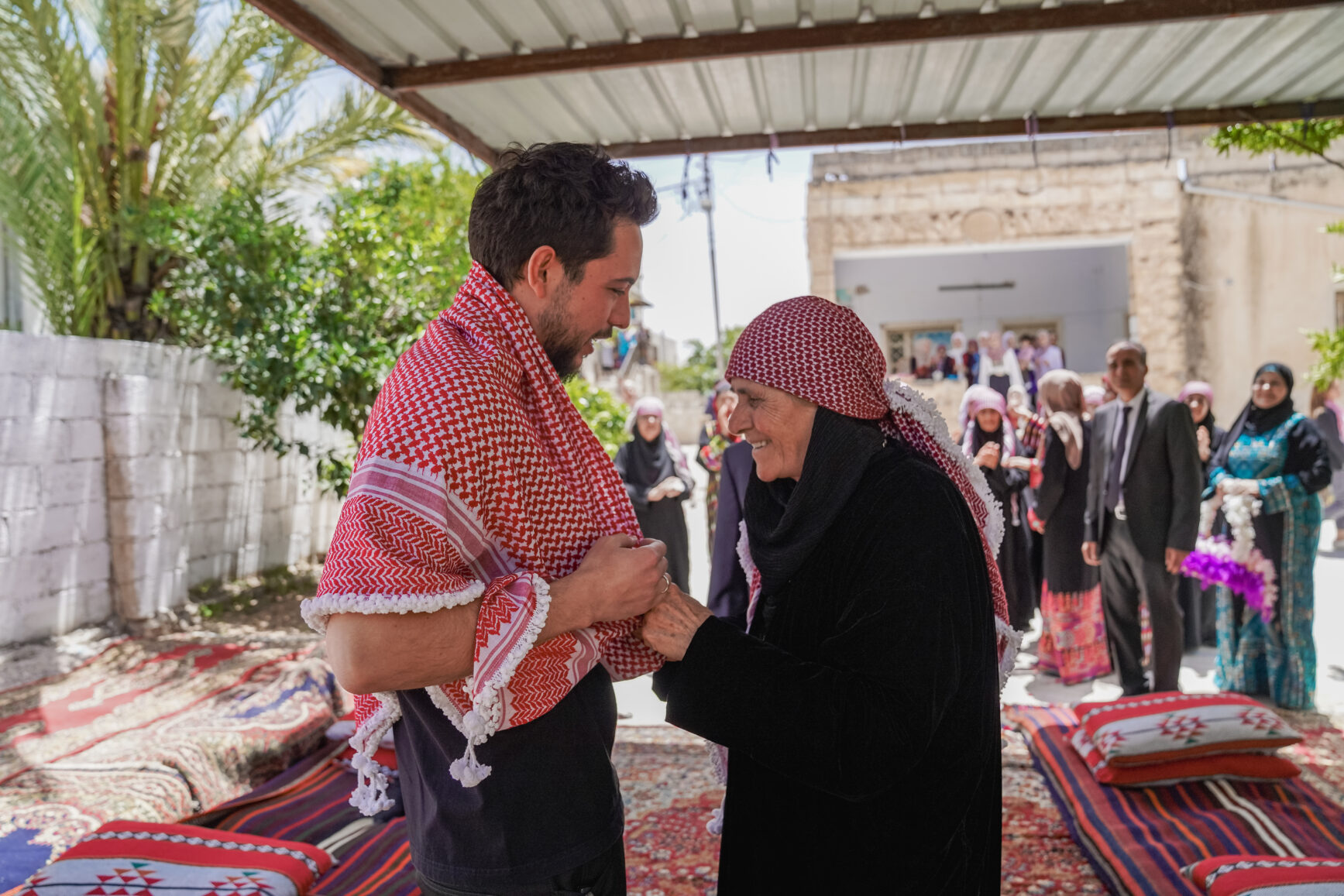 الحاجة ترفة عبيدات تهدي ولي العهد "شماغ مهدب" خلال زيارته منزلها في حرثا-صور