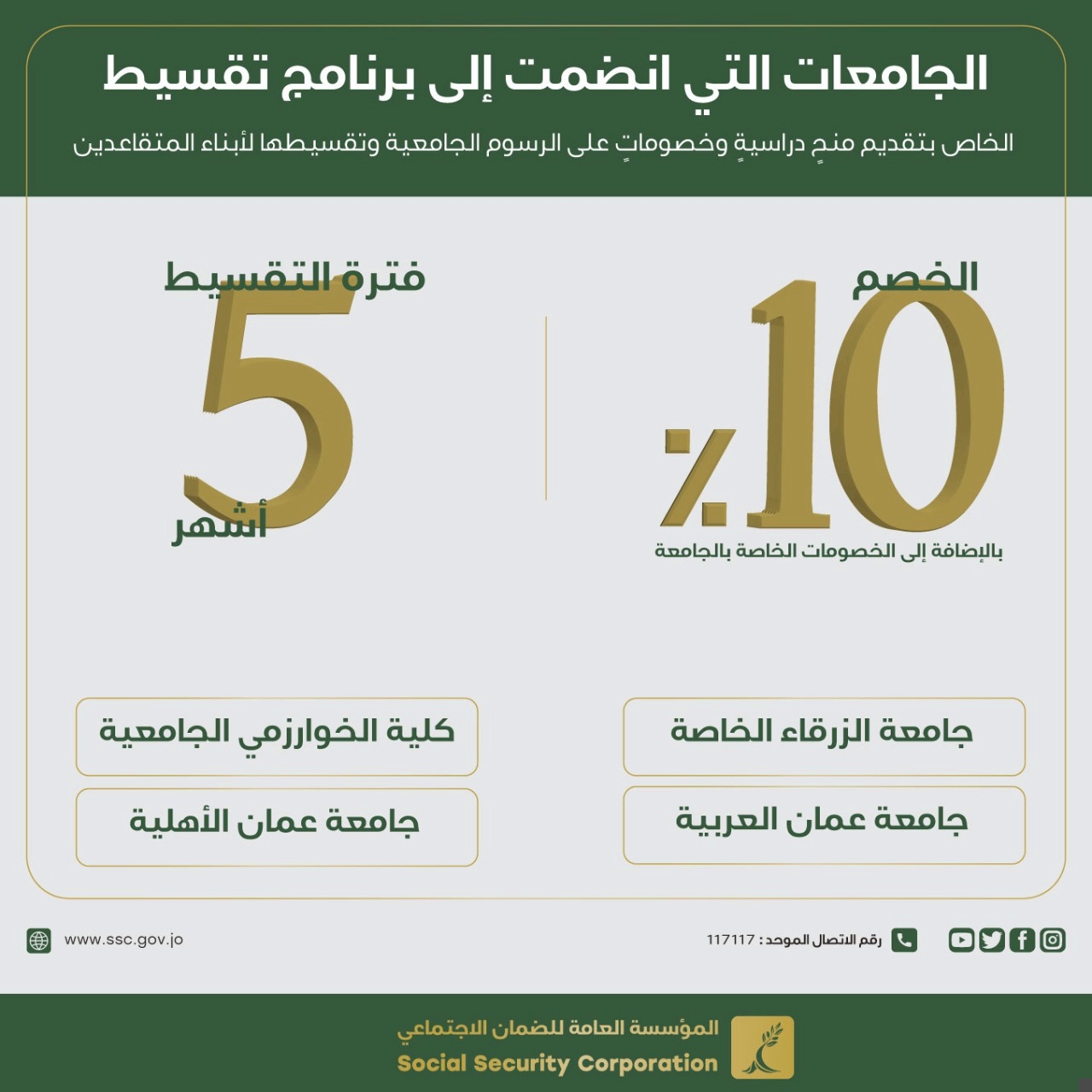 الضمان وجامعات عمان العربية والزرقاء الخاصة وعمان الأهلية وكلية الخوارزمي تبدأ العمل بمذكرات التفاهم المبرمة بين الطرفين لتقديم مزايا للمتقاعدين
