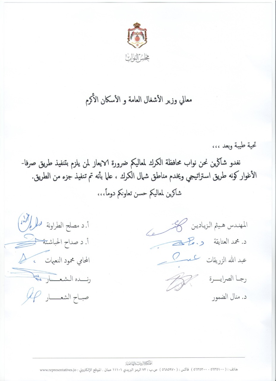 نواب الكرك يطالبوا الحكومة بإتمام طريق صرفا- الغور وإقامة سد في مدين