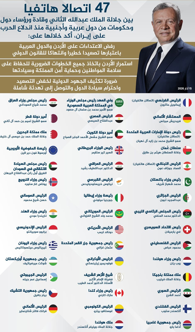 الملك يتلقى 47 اتصالا هاتفيا من زعماء ورؤساء دول منذ اندلاع التصعيد في الشرق الأوسط