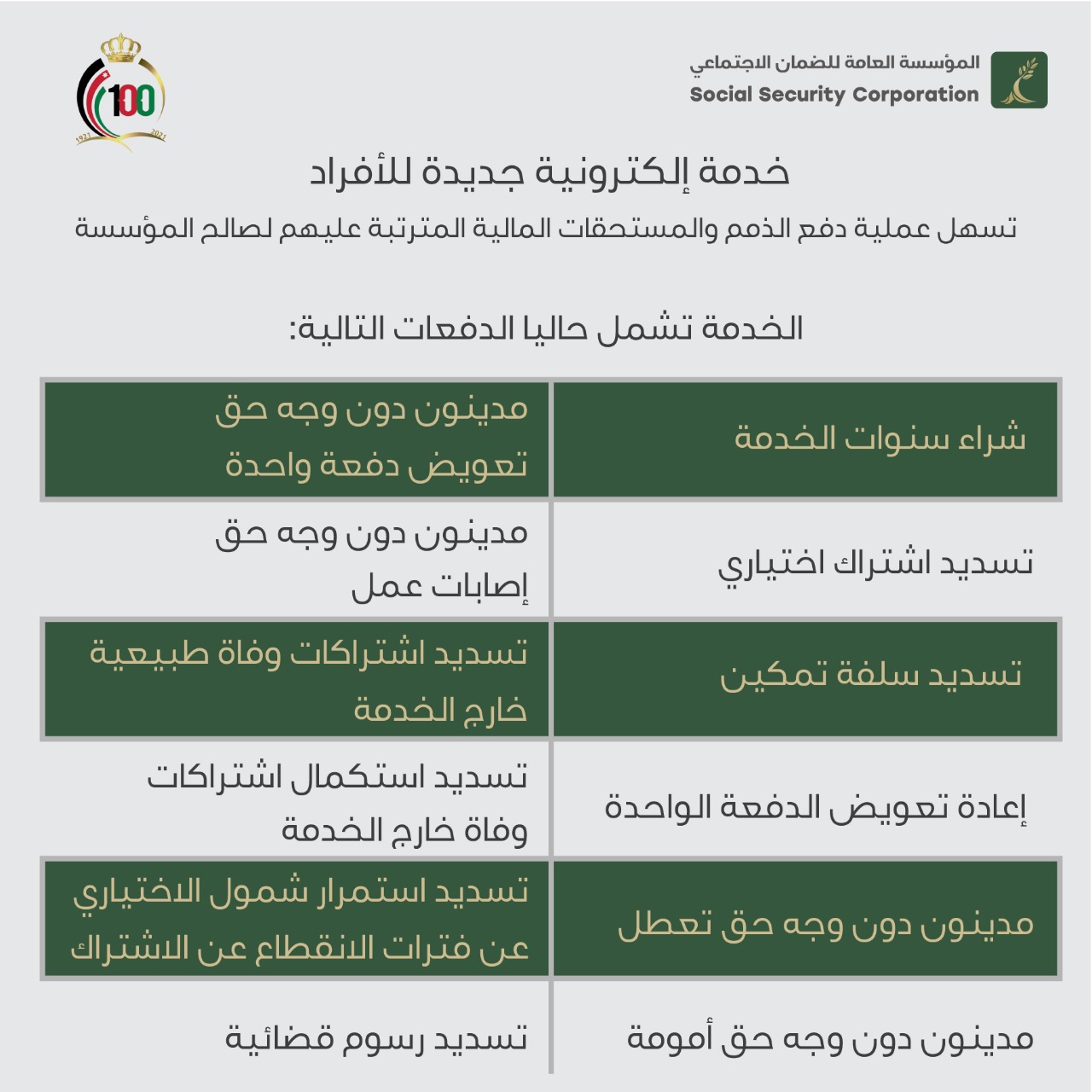 الضمان الاجتماعي : إطلاق خدمة إلكترونية جديدة للأفراد تسهل عملية دفع الذمم والمستحقات المالية المترتبة عليهم لصالح المؤسسة