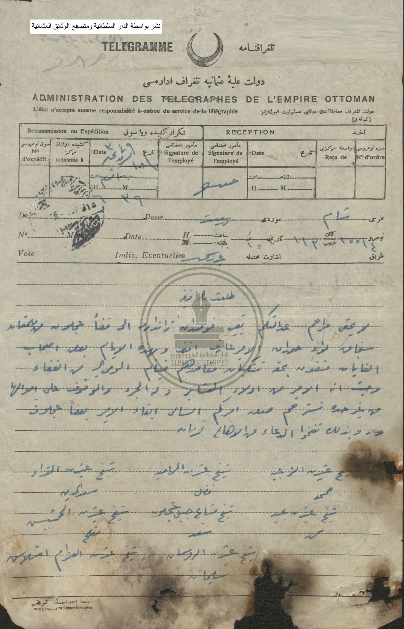 من الذاكرة / كتاب من شيوخ عشائر عجلون إلى وزير الداخلية في الأستانة طلعت بك . عام 1905م ( وثيقة )