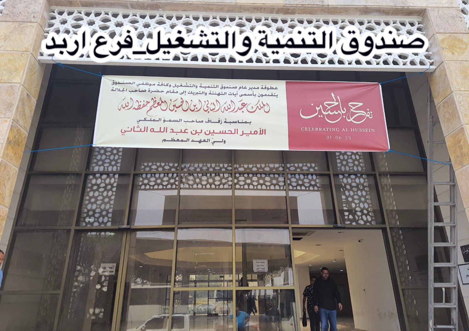 فرحاً وابتهاجاً بزفاف سمو الامير الحسين بن عبدالله الثاني -ولي العهد، على الآنسه رجوه خالد السيف، يافطات صندوق التنميه والتشغيل تزين مداخل فروع الصندوق المنتشرة في كافة محافظات وبوادي المملكه .