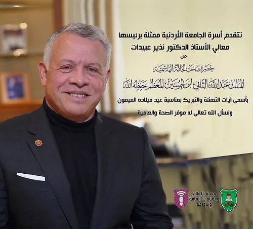 أسرة الجامعة الأردنية تهنئ جلالة الملك والوطن بعيد مولده الواحد والستّين