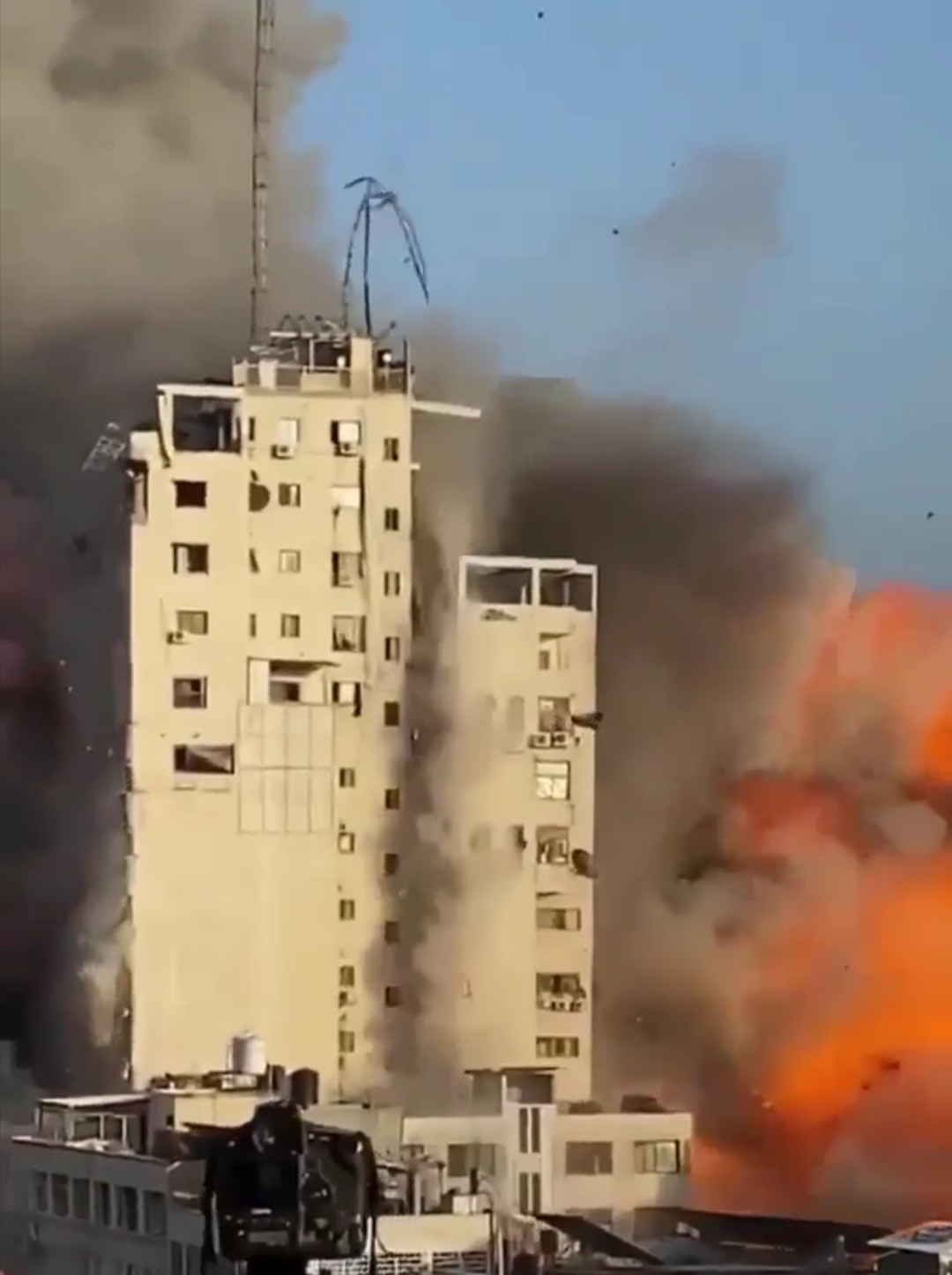 لحظة انهيار برج الجلاء الذي يضم مقر الجزيرة ومكاتب إعلامية في غزة جراء غارات اسرائيلية... فيديو