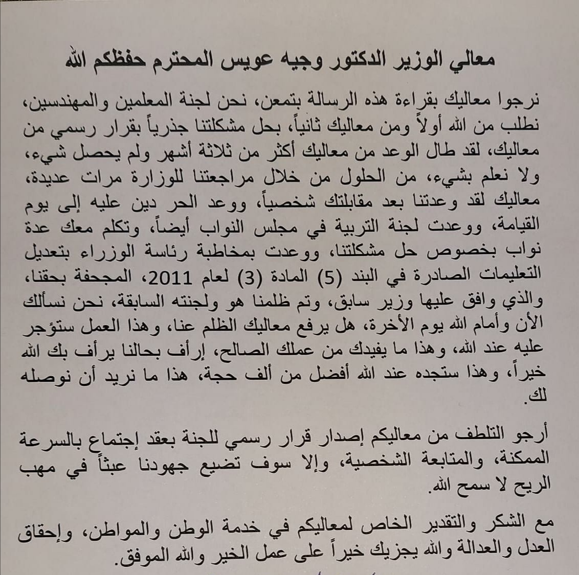 معلمون ومهندسون يناشدون وزير التربية بشأن مكرمة المعلمين
