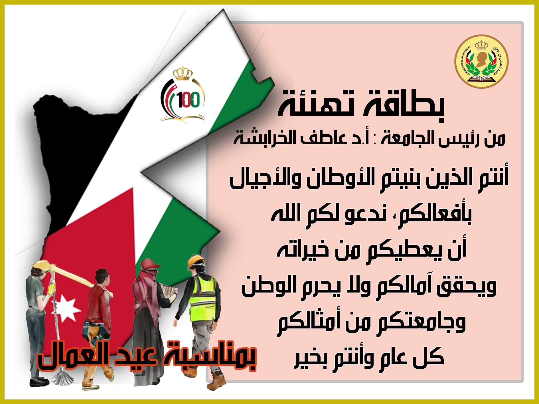 رئيس جامعة الحسين بن طلال يهنئ عمال الجامعة بمناسبة عيد العمال.