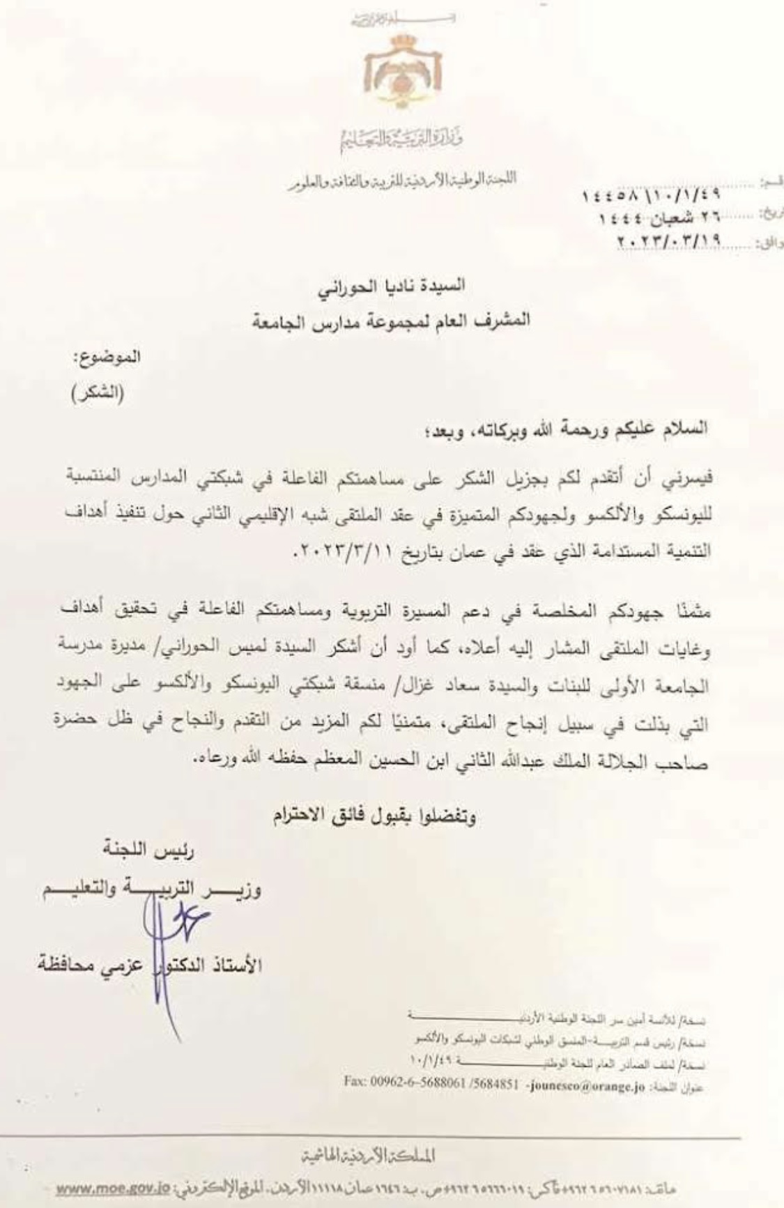 شكر من وزير التربية والتعليم لمجموعة مدارس الجامعة على انجاح ملتقى التنمية المستدامة