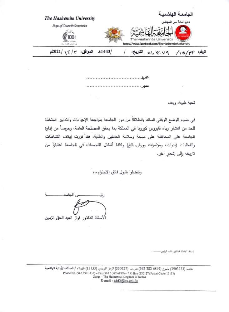 "الجامعة الهاشمية" توقف الأنشطة والفعاليات وكافة أشكال التجمعات