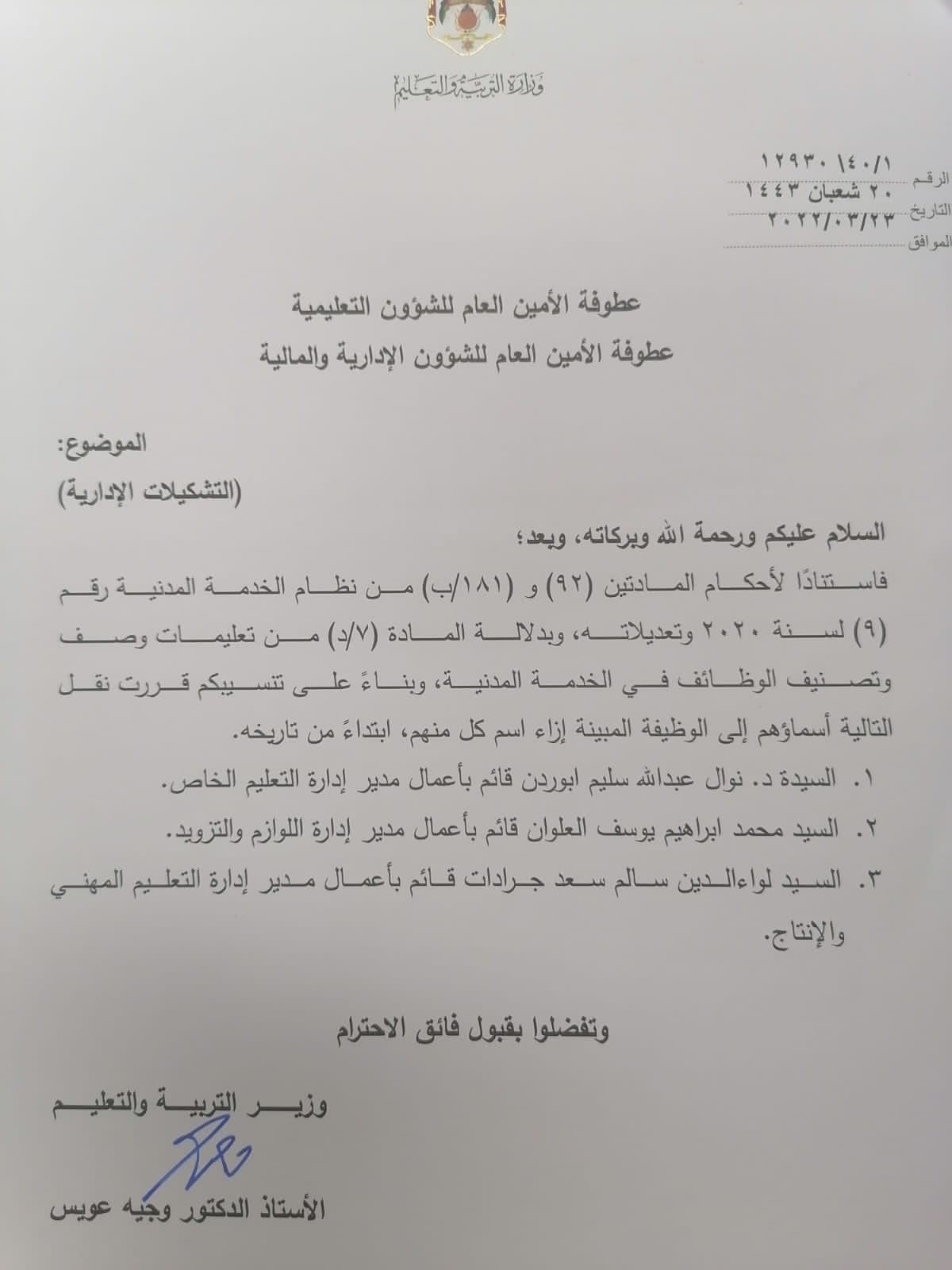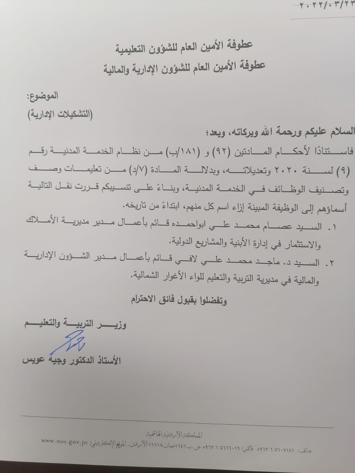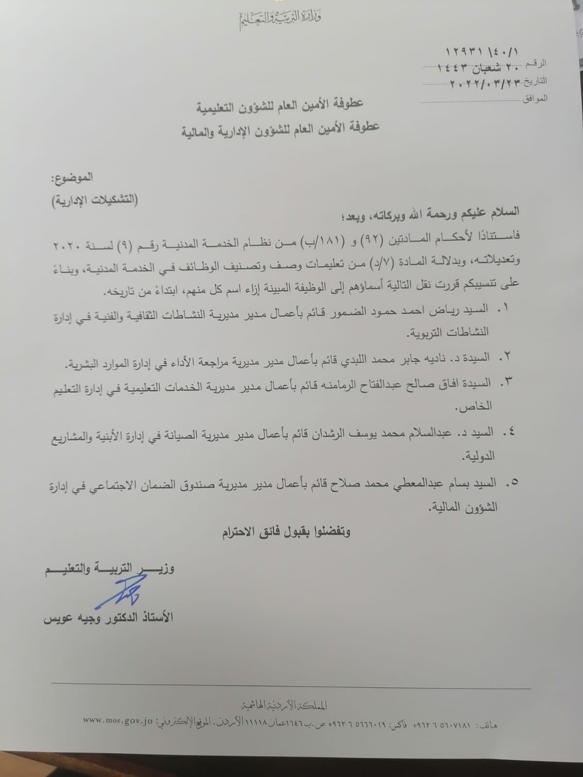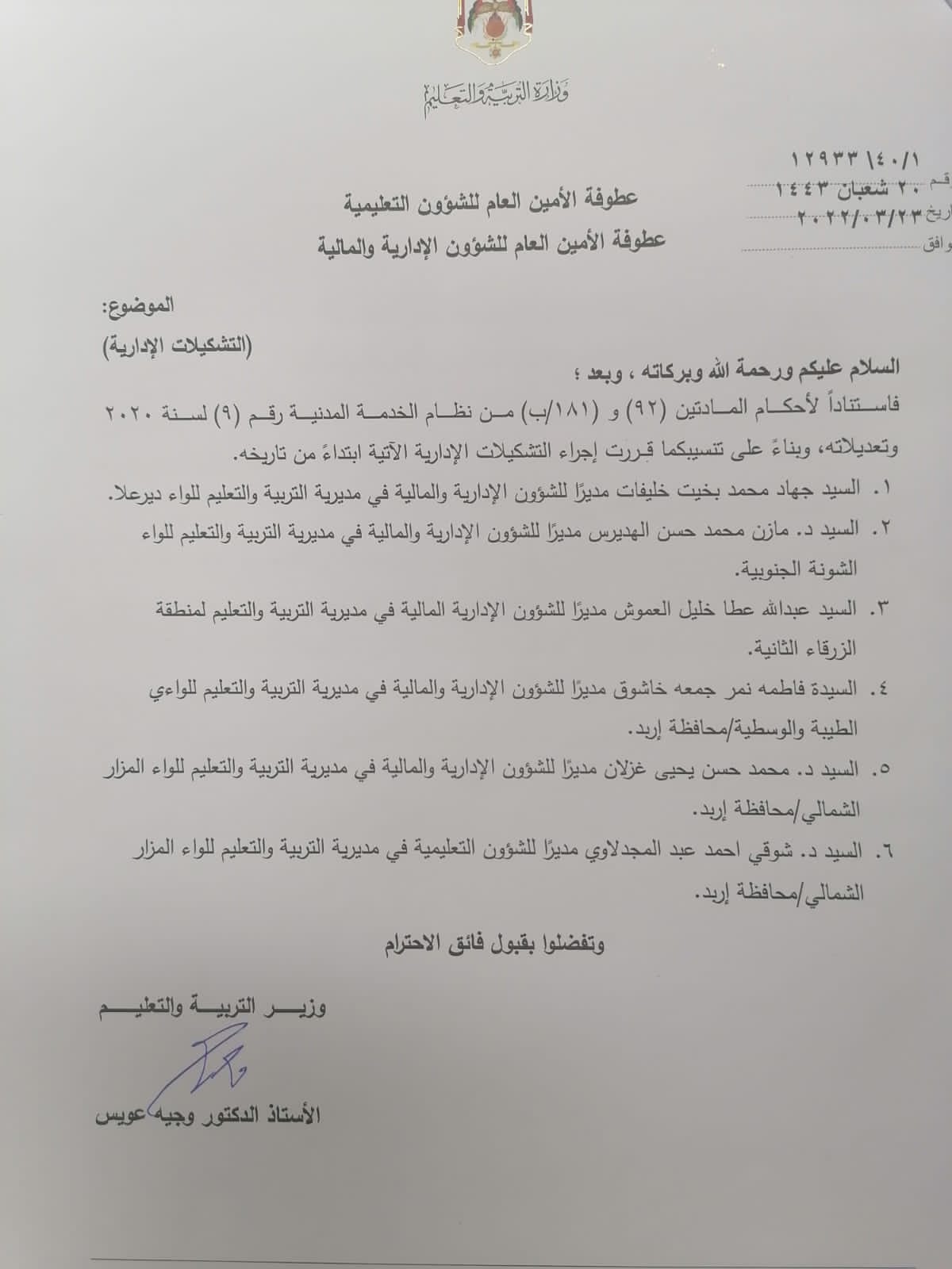 قرر وزير التربية والتعليم والتعليم العالي والبحث العلمي الدكتور وجيه عويس ، اجراء بعض التشكيلات في ادارت الوزارة ومديريات الميدان وتاليا الاسماء :-
