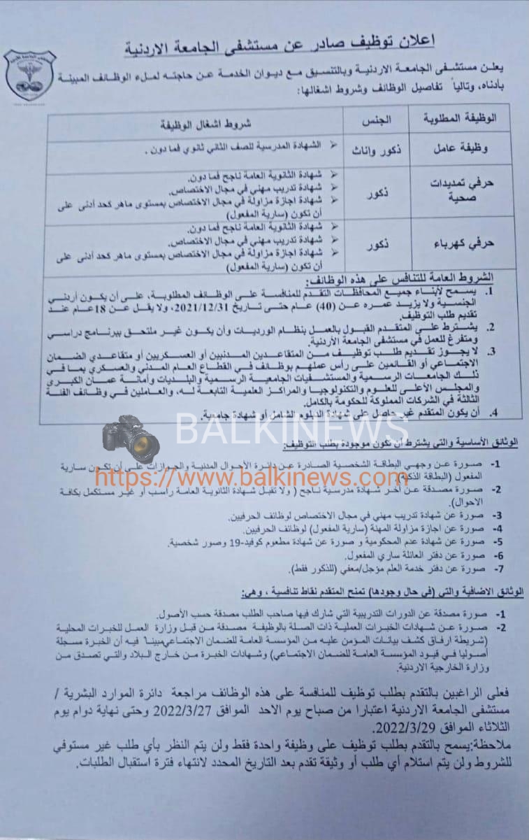 يعلن مستشفى الجامعة الأردنية عن حاجته لتعيين عدد من الموظفين ، ووفق المؤهلات والمواصفات التالية :