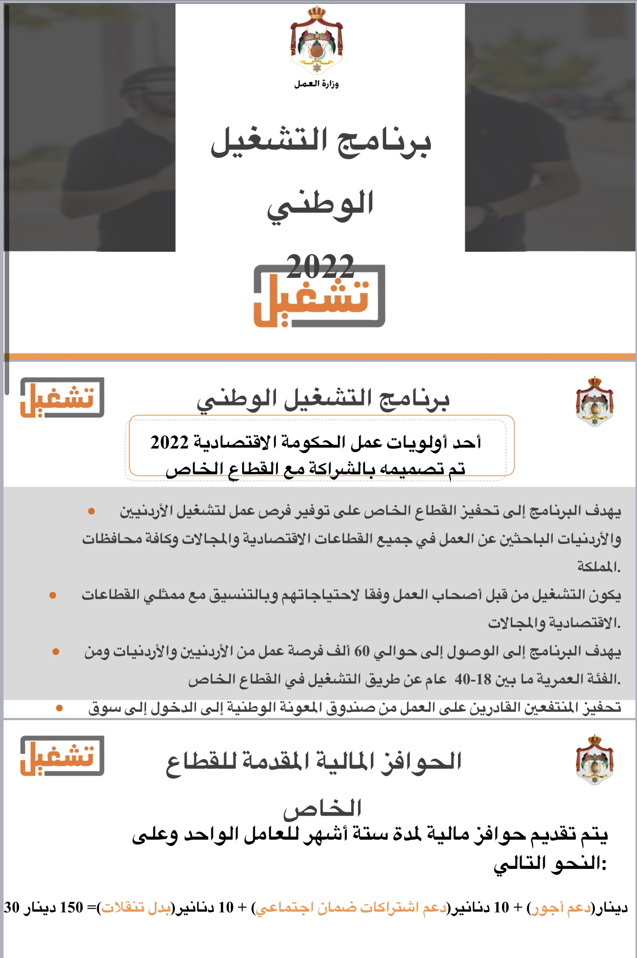 اطلقت حكومة الخصاونة برنامج تشغيل وطني يستهدف حوالي ٦٠ الف متعطل عن العمل بالشراكة مع القطاع الخاص .