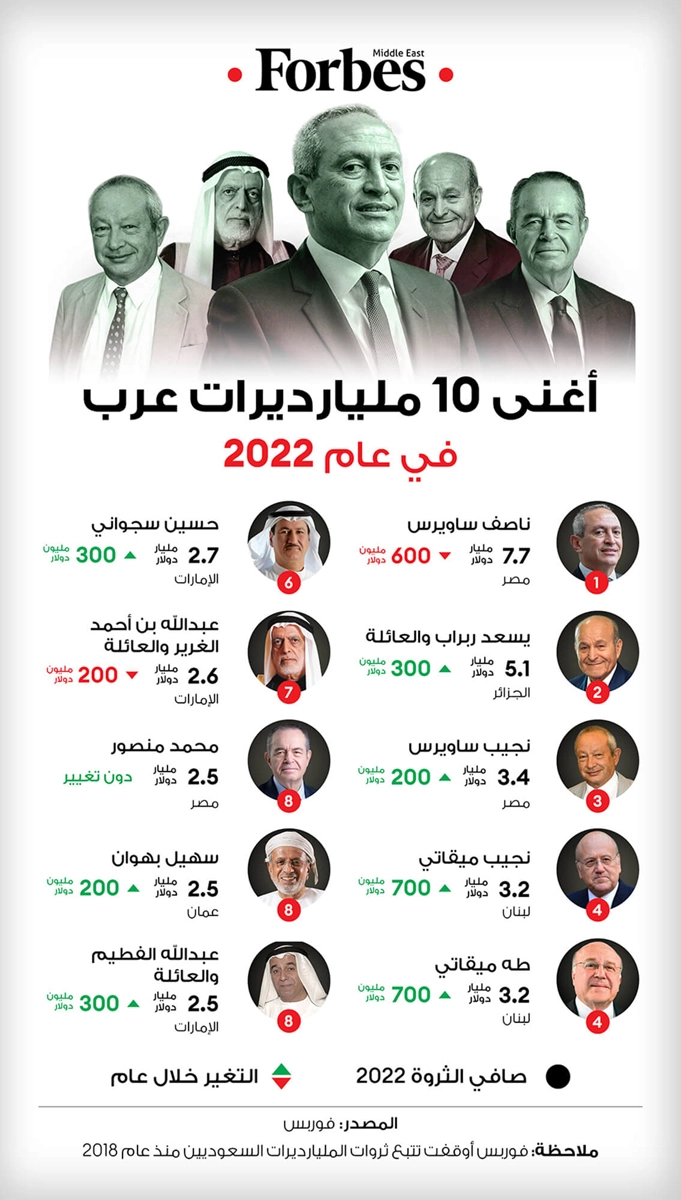 وتضم مصر ولبنان أكبر عدد من الأثرياء العرب بواقع 6 مليارديرات لكل منهما، بينما لدى الإمارات 3 مليارديرات في قائمة عام 2022 ، ومغربيان وقطريان ، وجزائري واحد وعماني واحد.