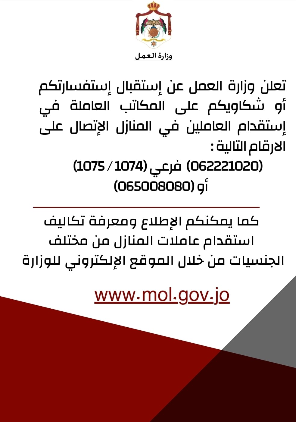 تعلن وزارة العمل عن إستقبال إستفساراتكم أو شكاويكم على المكاتب العامة في إستقدام العاملين في المنازل بواسطة التفاصيل المبينة .
