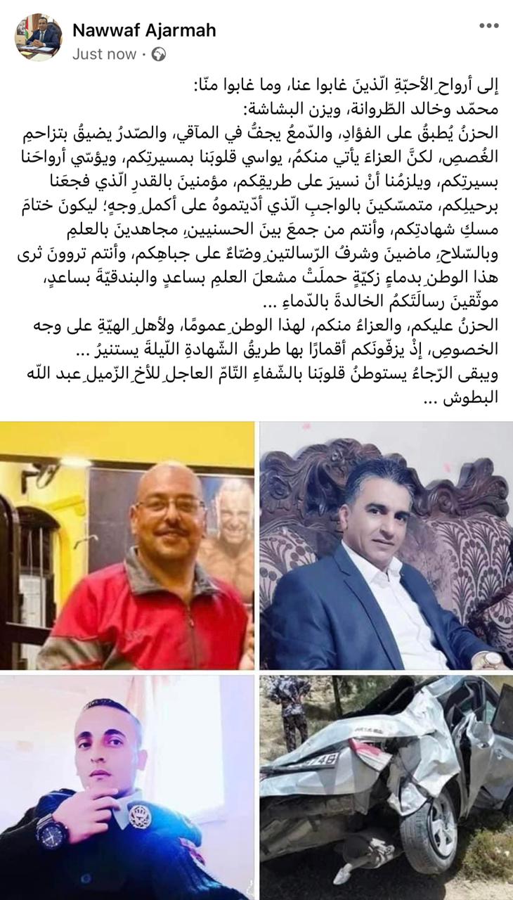 نعى الدكتور نواف العجارمة امين عام وزارة التربية والتعليم للشؤون التعليمية المغفور لهم باذن الله تعالى محمد وخالد الطراونة ويزن البشابشة (شهداء الواجب ) والذين ارتقوا يوم امس اثناء عودتهم من مكان عملهم لمحافظة الكرك ، حيث قال العجارمة في ادراج له عبر الفيسبوك :-