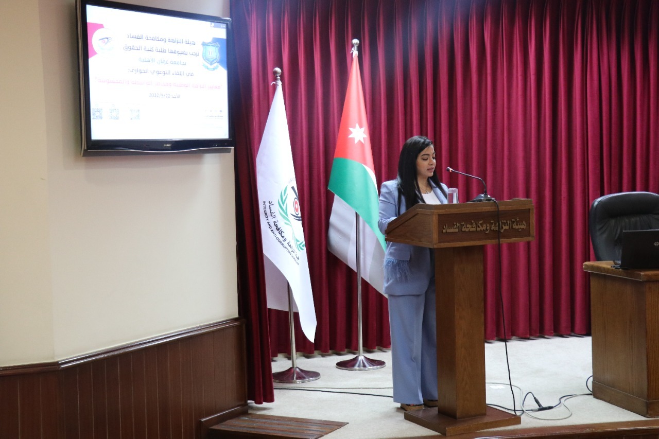 قامت كلية الحقوق في جامعة عمان الاهلية وضمن خطتها في التفاعل مع مؤسسات المجتمع وحرصها على توعية الطلبة بمعايير النزاهة الوطنية ودورهم الهام على تحقيق المبادئ الأساسية التي تسعى الجامعة لتعزيزها لديهم ومن أهمها العدالة وسيادة القانون، بتنظيم زيارة الى هيئة النزاهة ومكافحة الفساد .
