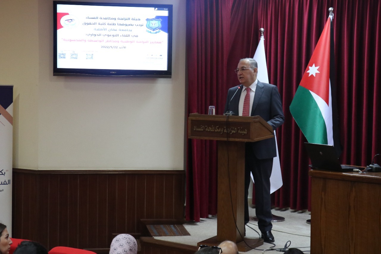حيث أكد رئيس مجلس النزاهة ومكافحة الفساد الدكتور مهند حجازي للطلبة أن جرائم الفساد تعد من أكثر الجرائم خطورة على أمن الدول والمجتمعات لما تخلقه من آثار سلبية وعواقب وخيمة على المستويين الاجتماعي والاقتصادي .