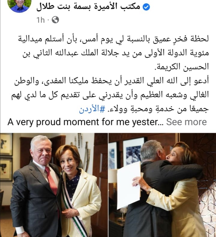وقالت سموها:"لحظة فخرٍ عميق بالنسبة لي يوم أمس، بأن أستلم ميدالية مئوية الدولة الأولى من يد جلالة الملك عبدالله الثاني ابن الحسين الكريمة".