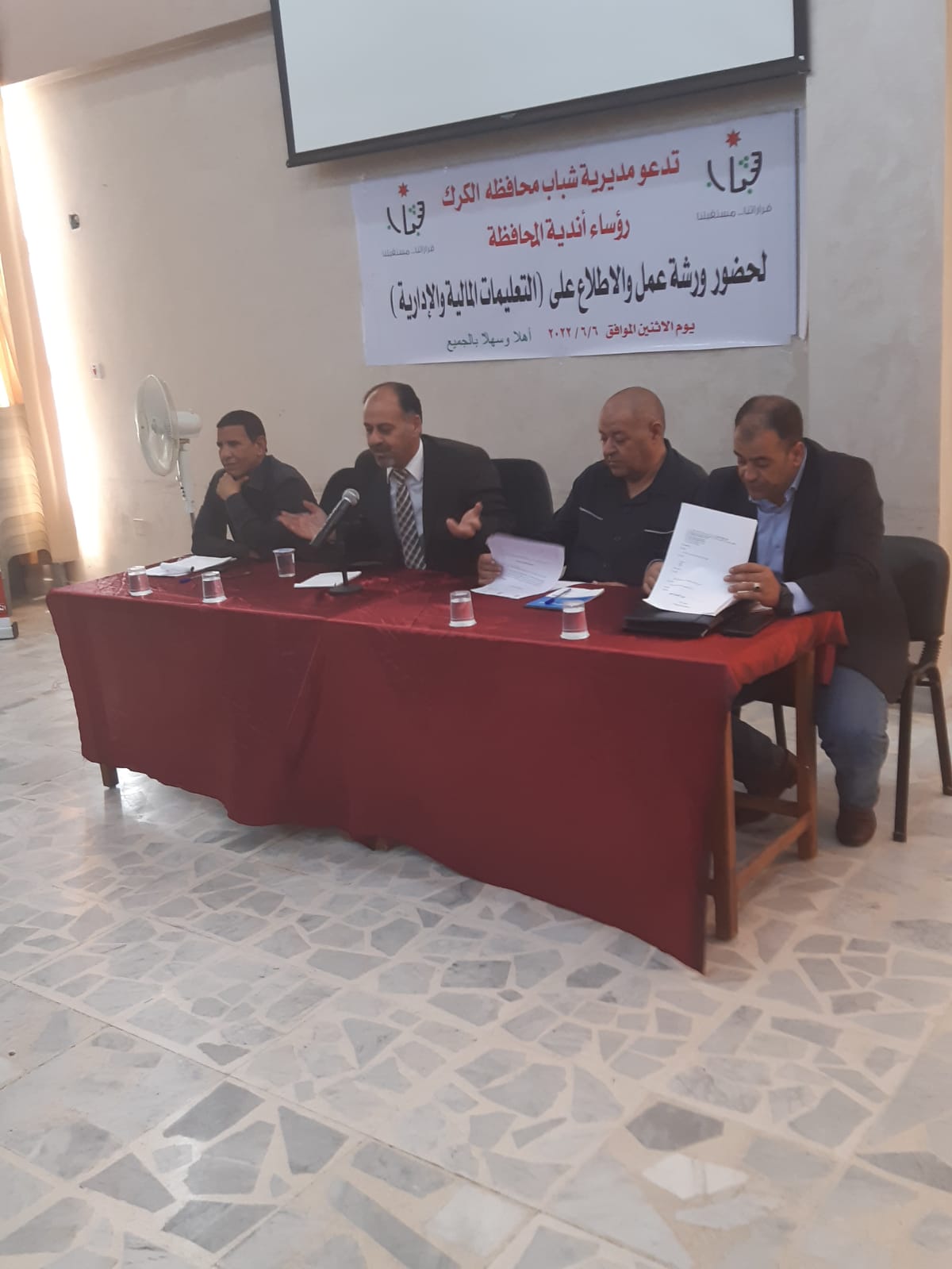 نظمت مديرية شباب الكرك ورشه تعريفه في التعليمات الماليه والاداريه للانديه في المحافظه حيث افتتح الجلسه الدكتور يعقوب الحجازين مدير مديرية شباب الكرك مرحبا في الحضور وبين أهمية عقد مثل هذه اللقاءات التي تثري العمل في الانديه وتعريفهم عن أهم التعديلات الجديده لنظام الانديه