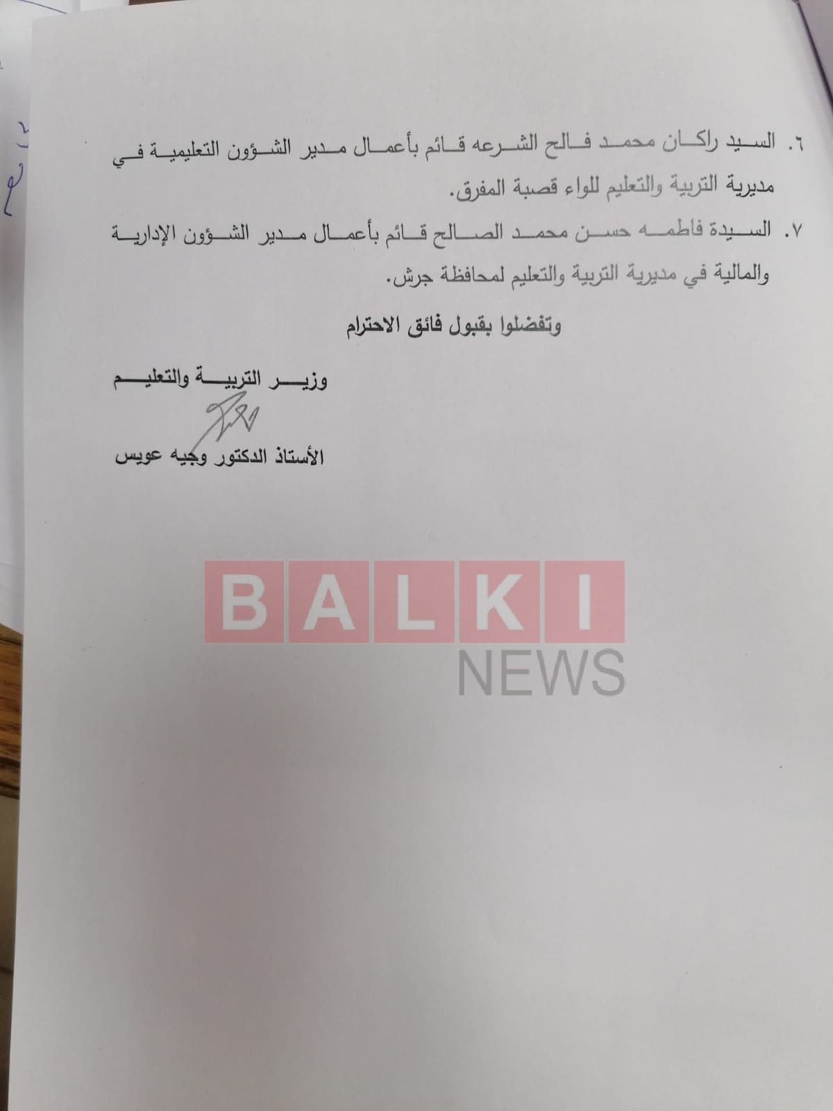 اجري ووزير التربية والتعليم الدكتور وجيه عويس عددا من التشكيلات الإدارية في عدد من المناصب بالوزارة