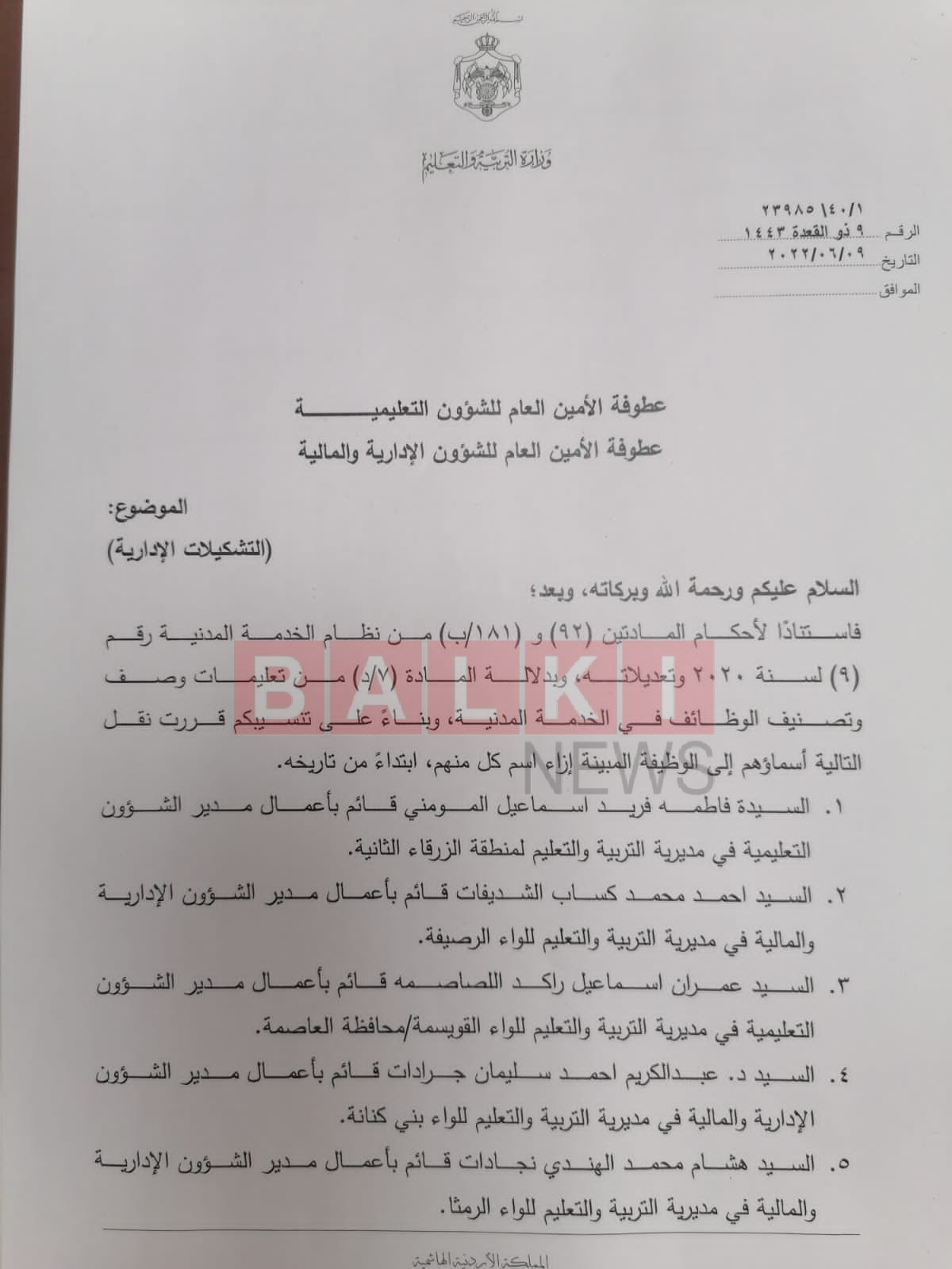 تشكيلات إدارية في وزارة التربية والتعليم "تفاصيل"