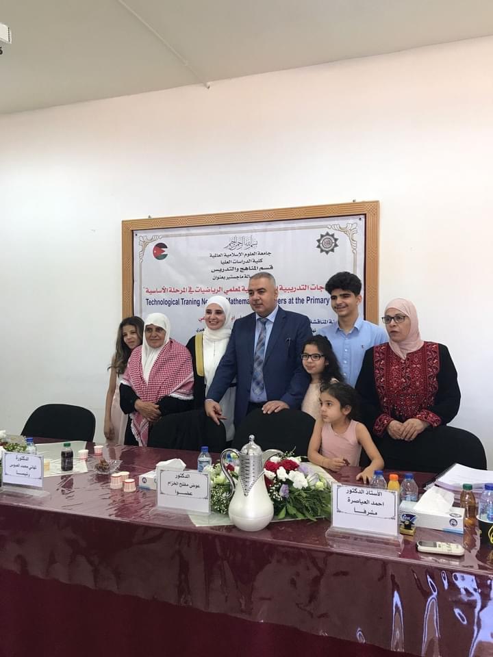 نوقشت رسالة الماجستير المقدمة من الباحثة تغريد علي ابراهيم السواعي ضمن متطلبات الحصول على درجة الماجستير بالعلوم التربوية من جامعة العلوم الاسلامية العالمية وعنوانها: (الاحتياجات التدريبية التكنولوجية لمعلمي الرياضيات في المرحلة الاساسية )وجرت المناقشة الوجاهية في قاعات الجامعة