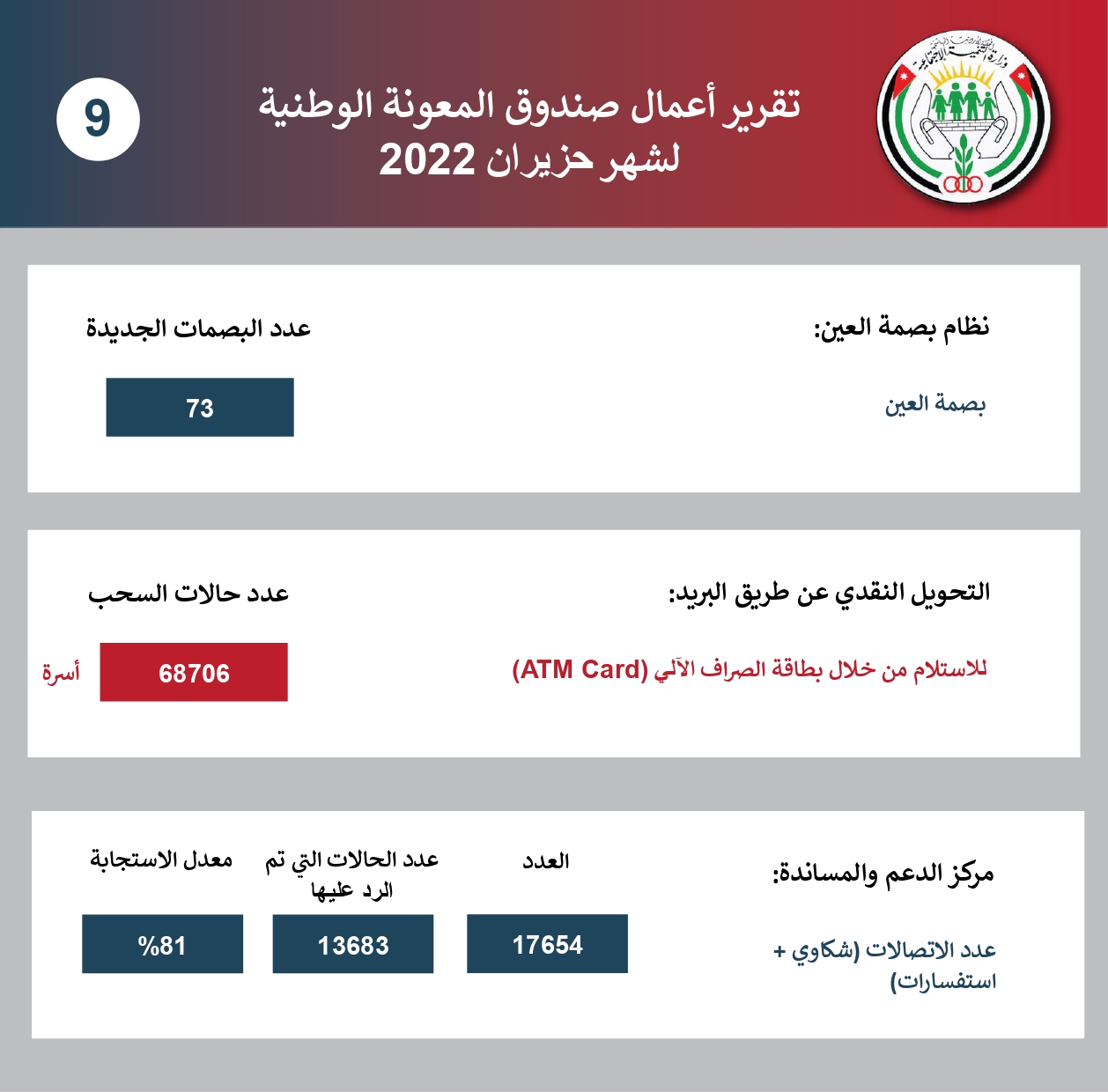 ووفقا لتقرير أعمال صندوق المعونة الوطنية لشهر حزيران الماضي، لم تستفد أي أسرة جديدة من المعونة الشهرية المتكررة، واستفادت 690 أسرة جديدة من برنامج المعونات المالية الطارئة العاجلة والفورية، و96 أسرة جديدة من برنامج التأهيل الجسماني، و160 شخصا استفادوا من برنامج دعم برامج التدريب المهني لأبناء الأسر المنتفعة.