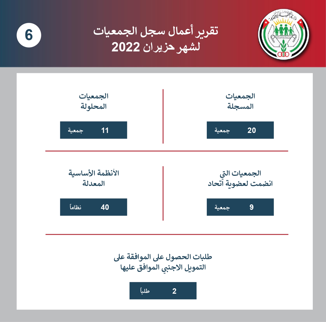 وفيما يتعلق بالسجل العام للجمعيات، قال خريس، إنه تم تسجيل 20 جمعية، وحل 11 أخرى، فيما انضمت 9 جمعيات لعضوية اتحاد، وجرت الموافقة على 40 نظاما أساسيا معدلا، وتم الموافقة على طلبين للحصول على التمويل الأجنبي.