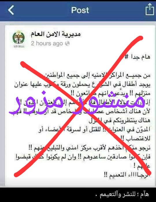 حذر الناطق الاعلامي باسم مديرية الامن العام المواطنين من منشورات مزورة تحمل شعار المديرية وتدَّعي وجود عصابات تستخدم اطفالاً يحملون اوراقاً لاستدراج الضحايا وغيرها من منشورات تحمل ذات الاكاذيب، كشخص يحمل ورقة عندما يعطيها للضحية يُغمى عليه او عربة بداخلها طفل في الشارع .