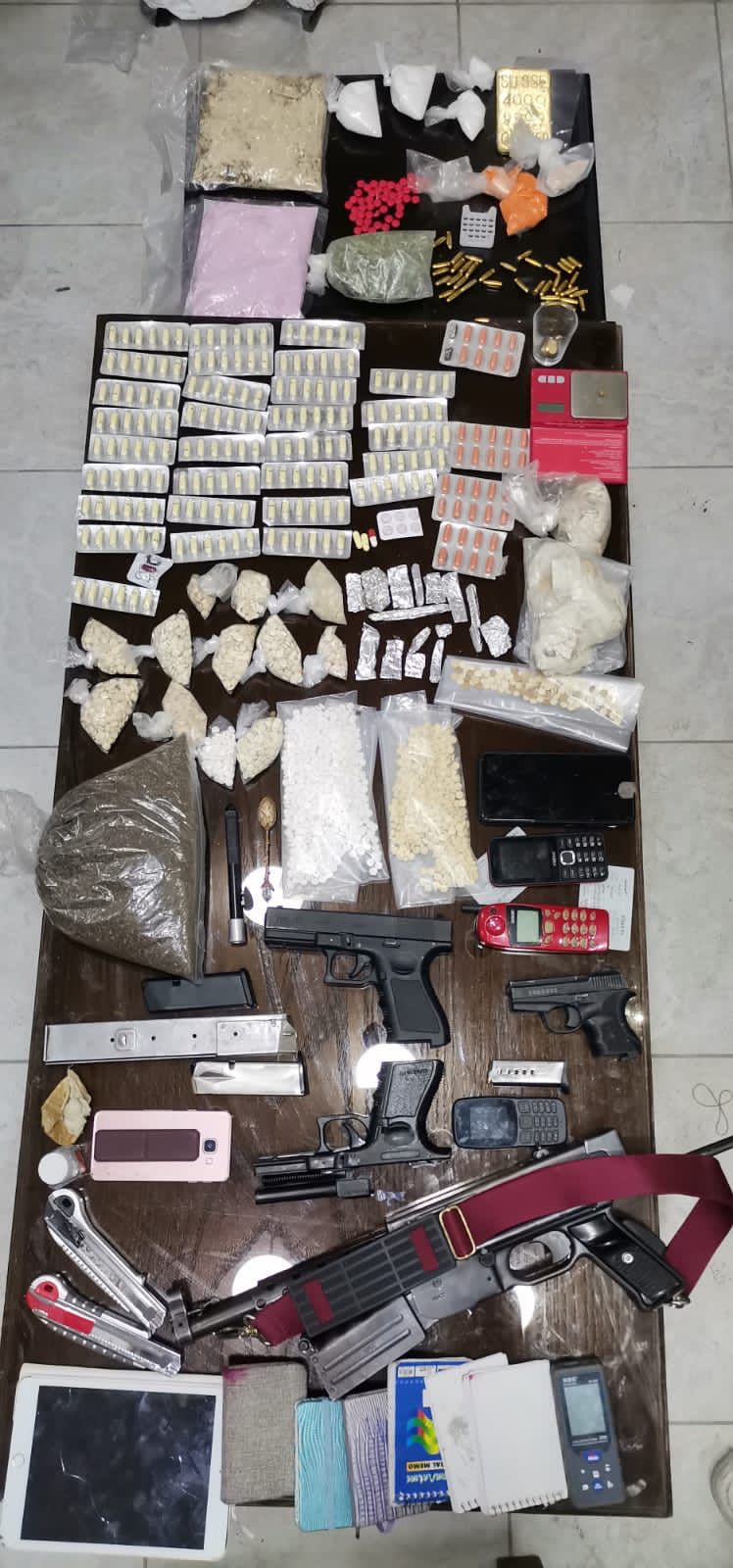 وبين أنه وفي قضية أخرى في لواء الرمثا داهمت قامت قوة أمنية معززة بالفريق الخاص لإدارة مكافحة المخدرات، ألقت القبض على مطلوب بقضايا مخدرات، وبحوزته كميات كبيرة من المواد مخدرة وأسلحة نارية وذخائر، بعد أن قام المحققون في الإدارة بمتابعته وتحديد مكان تواجده.