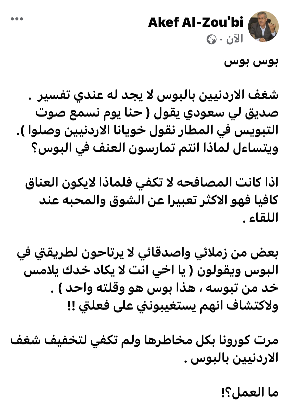 انتقد الوزير الاسبق العين عاكف الزعبي شغف الاردنيين بالبوس في المناسبات وقال في ادراج له عبر الفيسسوك تحت عنوان ( بوس بوس )