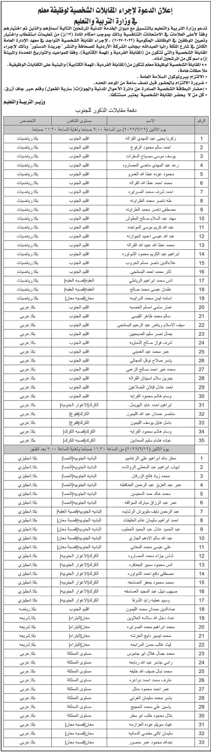 أعلنت وزارة التربية والتعليم، اليوم الأحد، بالتنسيق مع ديوان الخدمة المدنية، دعوتها لإجراء المقابلات الشخصية لوظيفة معلم.