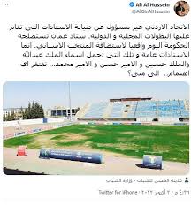 وأضاف فيها: “الاتحاد الاردني غير مسؤول عن صيانة الاستادات التى تقام عليها البطولات المحلية و الدولية. ستاد عمان تستصلحه الحكومة اليوم واقعيا لاستضافة المنتخب الاسباني. انما الاستادات عامة و تلك التى تحمل اسماء الملك عبدالله والملك حسين و الامير حسن و الامير محمد… تفتقر اي اهتمام.. الى متى؟”.